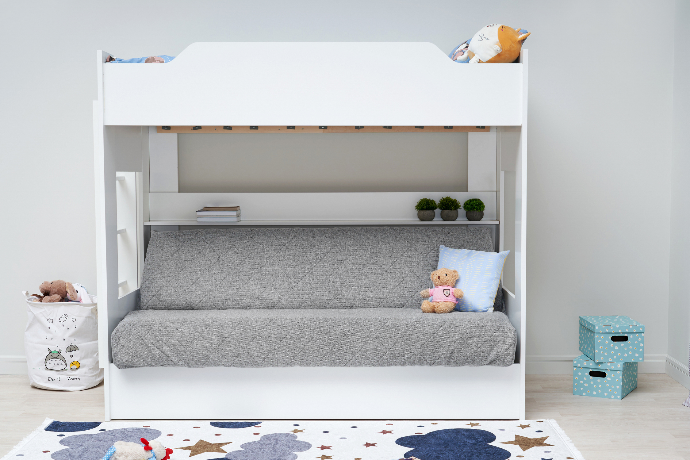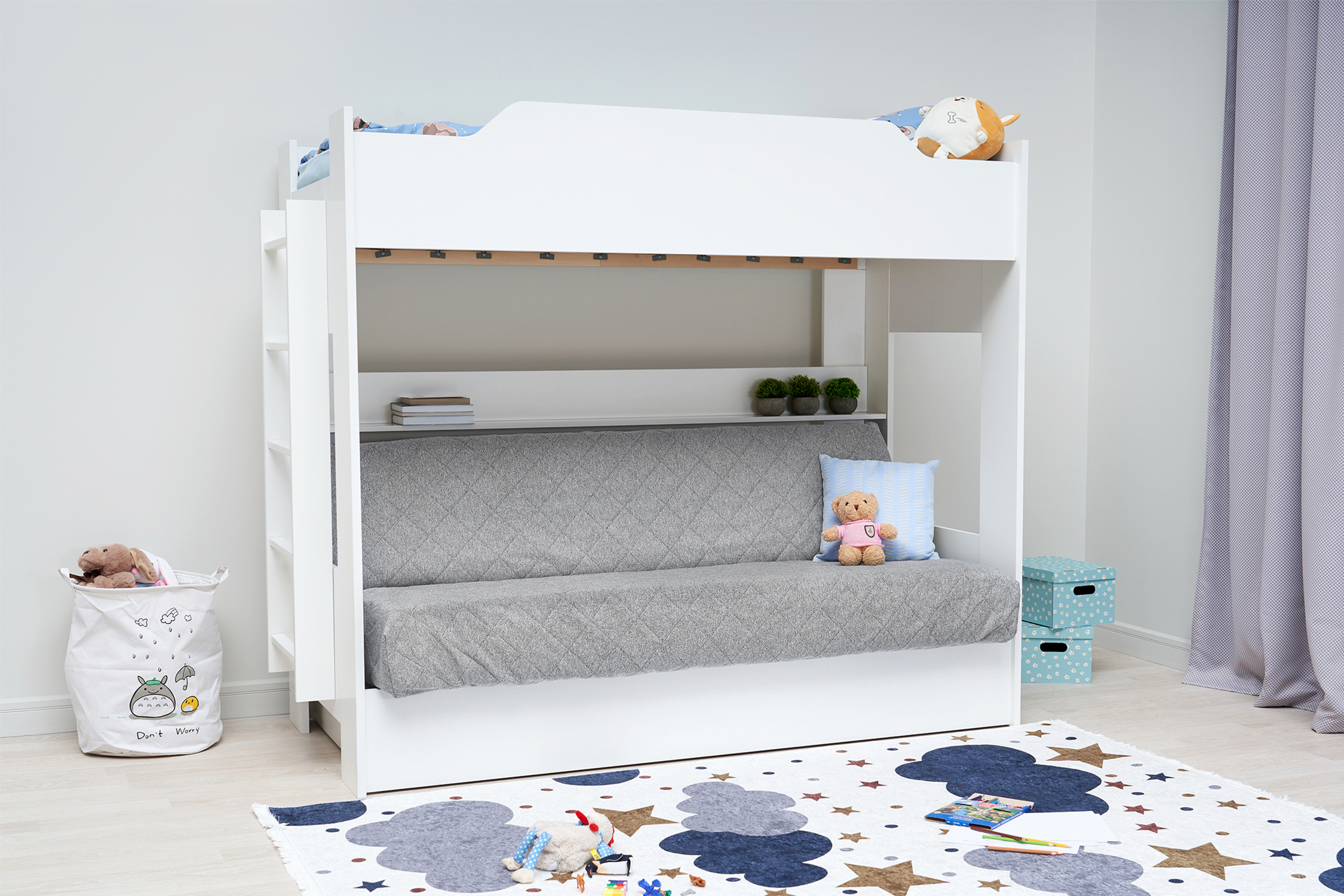 Механизм трансформации дивана: «Книжка». Рекомендуемая высота матраса на верхний ярус 17 см. Максимальная нагрузка на верхний ярус 50 кг. Лестница может быть установлена с обеих сторон кровати. Высота бортика 30 см. Максимальная нагрузка на нижний ярус 90 кг. Чехол съемный.